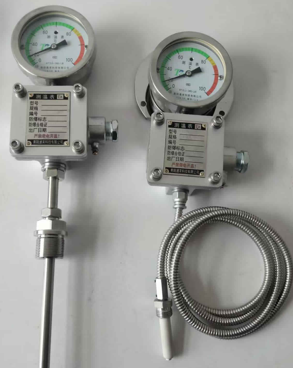 | WTZd系列防爆仪表 产品特点: 新一代液体压力式温度计以及由此开发的系列温度仪表,克服了 原仪表性能单一、可靠性差以及温包体积大的缺点,将测温元件体积缩小到原来的1/30或1/60,创造性地将传感器热电阻安装于测温元件内,实现了机电一体化的 测温功能。形成了以液体压力式温度计为基本测温仪表的远传、防爆、防震、防腐、电接点、温度信号变送等多功能、系列化温度仪表。 适用范围: 爆炸性气体混合物危险场所:1区、2区; 爆炸性气体混合物:ⅡA、ⅡB; 温度组别:T1~T6。 型号含义: 规格表: 普通型 WTZ-280(z) 液体压力式单指示防震温度计 WTZ-288 液体压力式电接点双上限温度计 WTZ-287 液体压力式电接点单上限温度计 WTZ-286 液体压力式电接点上下限温度计 WTZ-285(z) 液体压力式铂热电阻远传温度计(防震) WTZ-284(z) 液体压力式热电偶远传温度计(防震) WTZ-283(z) 液体压力式铂热电阻温度变送器温度计(防震) 隔爆型 WTZd-288 液体压力式防爆电接点双上限温度计 WTZd-287 液体压力式防爆电接点单上限温度计 WTZd-286 液体压力式防爆电接点上下限温度计 WTZd-285(z)液体压力式防铂热电阻远传温度计(防震) WTZd-284(z)液体压力式防爆热电偶远传温度计(防震) WTZd-283(z)液体压力式防爆铂热电阻温度变送器温度计(防震 技术参数: 环境温度:-20-55℃,相对温度小于95%,海拔高度小于2000米; 指示精度:1.5级; 时间常数:34秒; 铂热电阻精度等级:性能指标符合国际IEC751-83及国家ZBY301-85标准, 精度等级B级; 测量温度范围:-40∽500℃ 铂热电阻最大激励电流5mA; 绝缘等级:F级 防爆等级: ExdⅡCT4-T6 Gb ExdⅡBT4 防护等级:IP55 IP54 IP45 IP44 产品视频展播 |